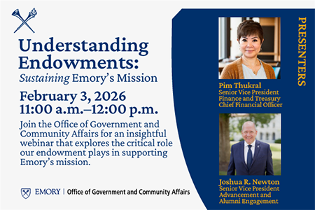 Internal Webinar: Understanding Endowments OGCA is hosting a special webinar focused on the critical role our endowment funding plays in supporting Emory's mission. Titled “Understanding Endowments: Sustaining Emory’s Mission,” the event is at 11 a.m. on Tuesday, Feb. 3, and registration is required. |