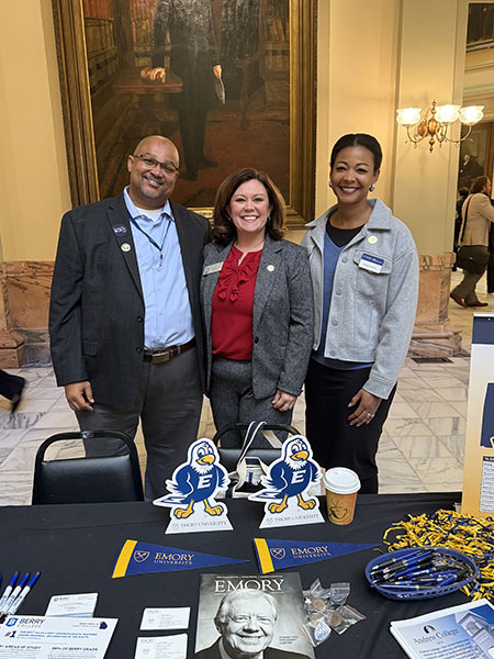 | | GICA Day at the Capitol On Tuesday, Jan. 13, Emory participated in GICA (Georgia Independent College Association) Day at the State Capitol. Emory was well represented by Jetaun Davis, senior associate dean of admission–DeKalb, and George Lunkin, senior associate director in the Office of Financial Aid. Jetaun and George met with legislators to discuss the great work underway at Emory, including the continued expansion of Emory Advantage Plus and the positive impact of Emory students and alumni across Georgia. |